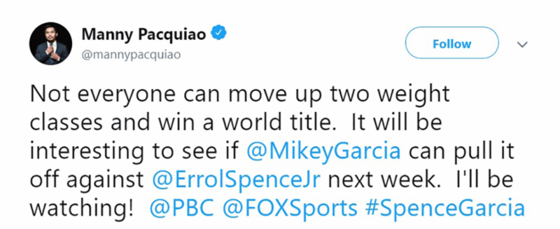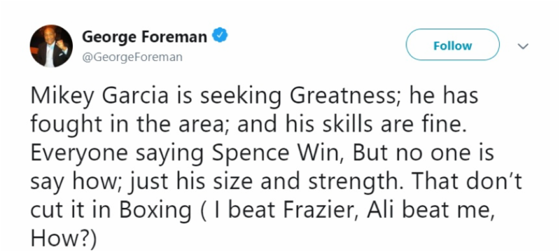 “It’s going to be a really good fight. Spence has good boxing skills and will present a big problem for Mikey.