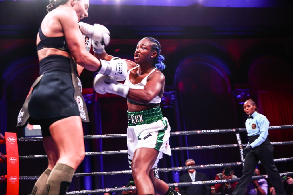 “I am the greatest woman of all time,” said Shields, who nearly earned a stoppage during a barrage in the closing moments of the eighth round. “I did it. She didn’t win a single round. I almost knocked her out. I swear I feel like I’m dreaming right now. Thanks to Christina Hammer and her team. They said she had a hard jab and they weren’t lying. Her jab is off the chain.