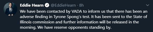 Oleksandr Usyk’s may be faced with a late replacement for his heavyweight debut with reports emerging that Tyrone Spong has returned an adverse doping test, according to Promoter Eddie Hearn.