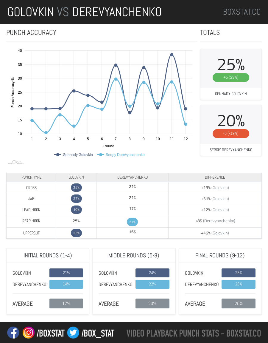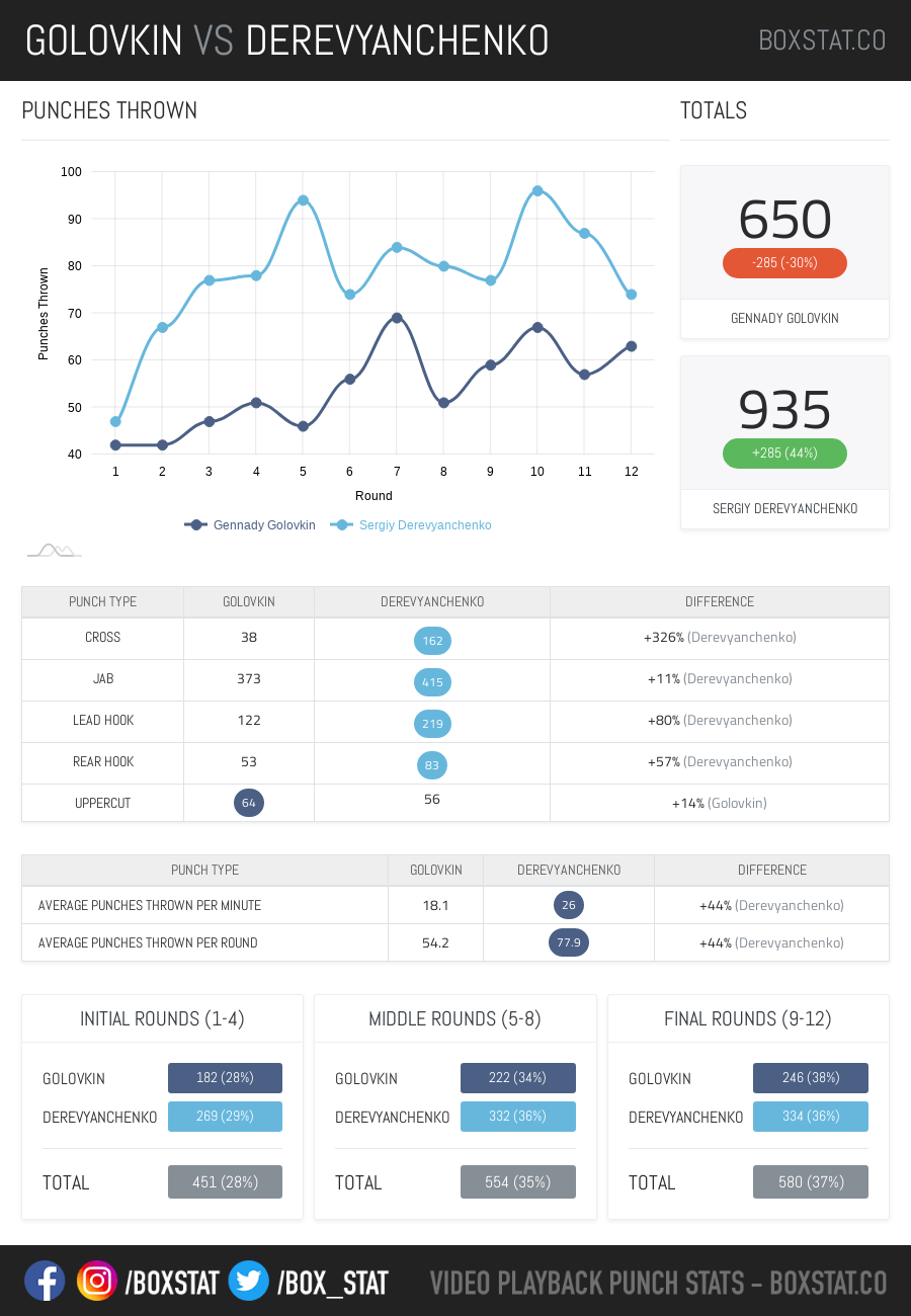 I would be in favour of seeing the rematch, I initially scored the fight in favour of GGG by a round or two, rubbishing claims of robbery but see why some scored in favour of Derevyanchenko especially after seeing the punch stats below. In an ideal world, I would love to see Golovkin ride off in to the sunset with his legacy and faculties in-tact, we can but dream.